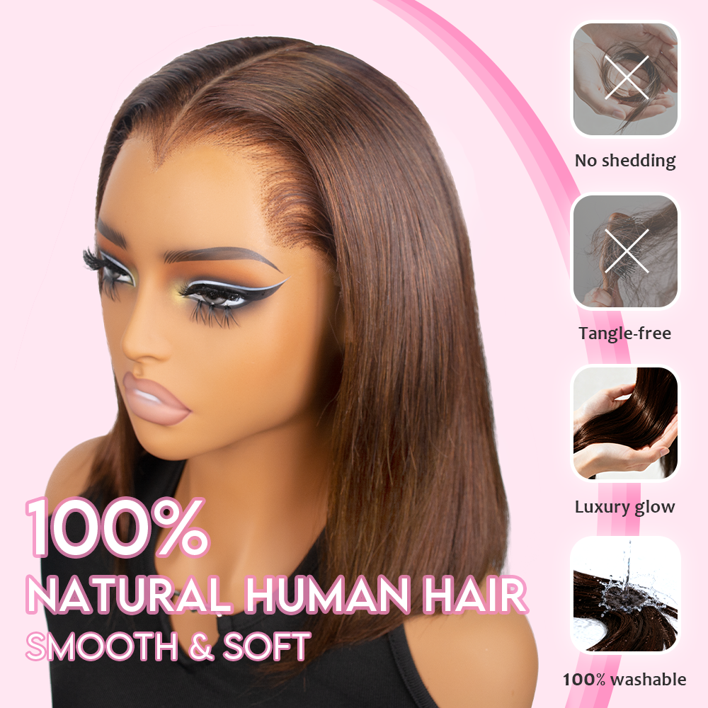 LUXUVIP Chocolate Brown Blunt Cut Bob Wig Features With Pre Plucked M Hairline, Giving Seamless & Natural Look. High Quality Human Hair, 13x4 Lace Can Achieve Versatile Style